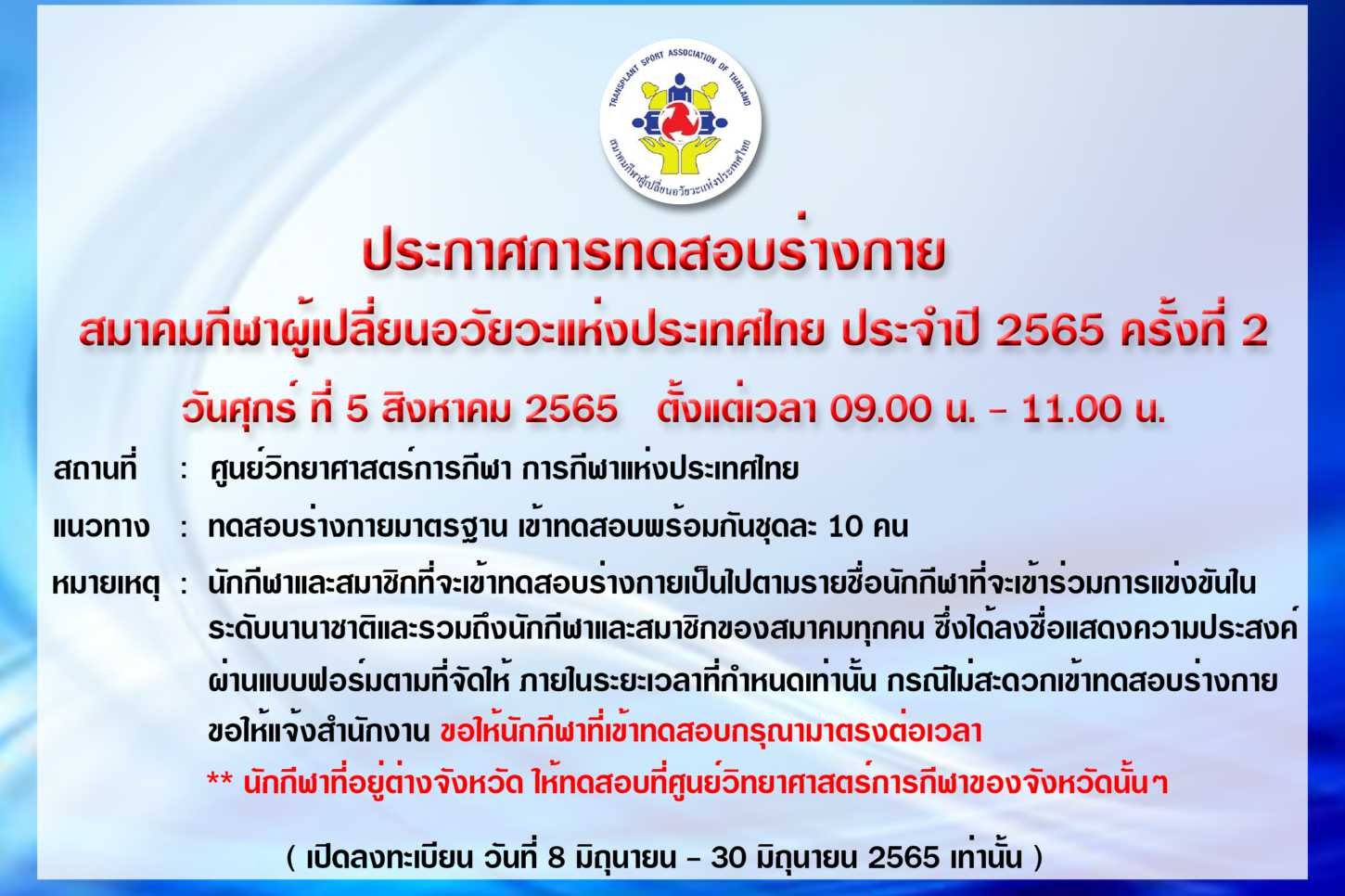 สมาคมกีฬาผู้เปลี่ยนอวัยวะแห่งประเทศไทย ขอแจ้งผลการพิจาร…